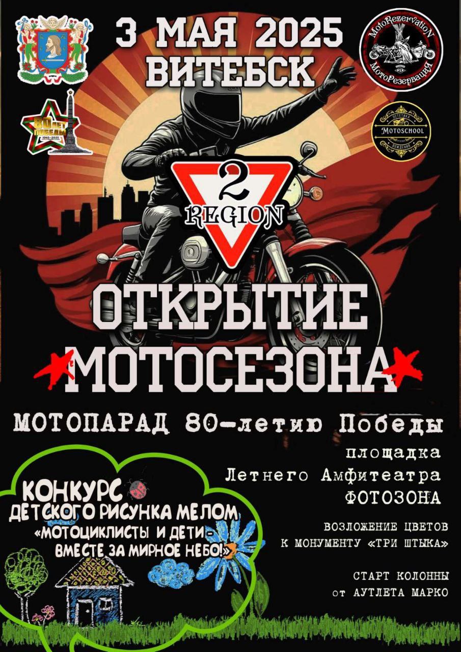 В Витебске 3 мая в Витебске состоится яркое событие — торжественное открытие мотосезона и мотопарад, посвященный 80-летию Победы в Великой Отечественной войне.