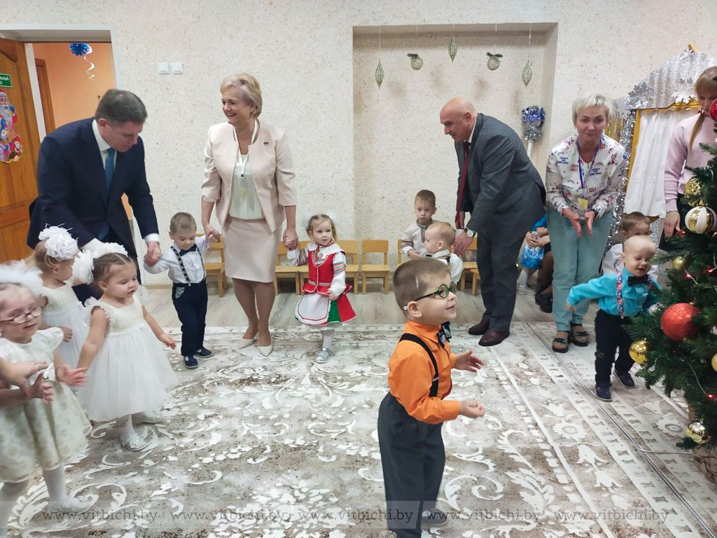 Хоровод вокруг ёлки, которую зажгли традиционным возгласом: «Раз, два, три, елочка гори!», вместе с детьми водили заместитель Премьер-министра Республики Беларусь Игорь Петришенко, заместитель председателя облисполкома Вячеслав Дурнов, начальник управления по здравоохранению облисполкома Михаил Вишневецкий. Они привезли воспитанникам дома ребенка много разных подарков, а главным стал сертификат на приобретение холодильного оборудования для пищеблока, чтобы и без того хорошее качество питания ребят стало еще лучше.