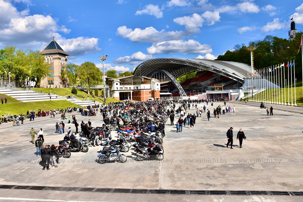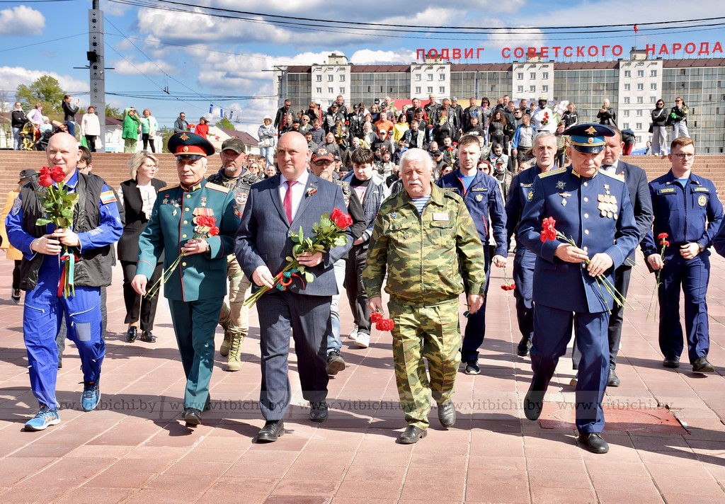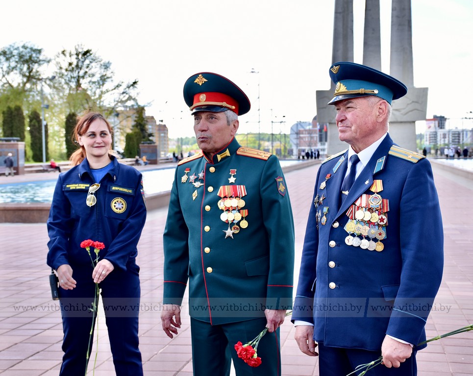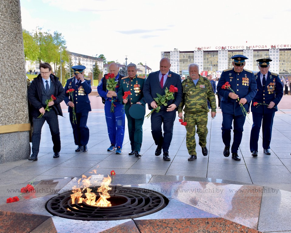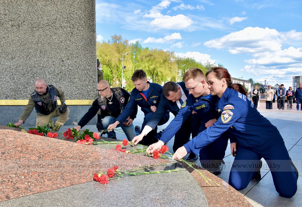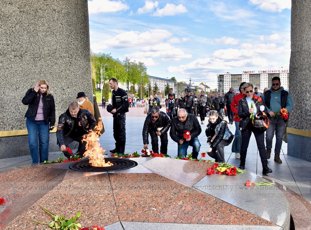 Участники автопробега «Города-герои – города Героев» возложили цветы к мемориальному комплексу в честь воинов-освободителей, партизан и подпольщиков на площади Победы. Здесь же они обменялись приветствиями с председателем Витебского областного Совета депутатов Дмитрием Демидовым, заместителем председателя горисполкома Виктором Глушиным и участниками витебского мотопробега «Дорогами памяти», которые открыли мотосезон с посещения знакового места у Вечного огня.