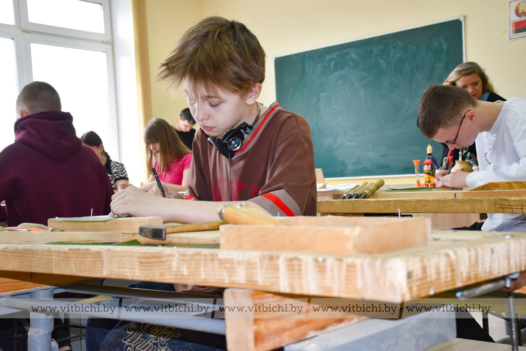 Руслан Сергеевич сам занимается деревообработкой более 10 лет и интерес к этому увлекательному занятию старается прививать своим учащимся. В объединении по интересам «Резьба по дереву» у него занимаются как мальчики, так и девочки. Причем последние, Екатерина Шляхто и Дарья Дадеко из агрогородка Бабиничи, делают успехи. Их умелые руки за год уже изготовили из дерева самые разные изделия: подставки под кружки, ложки, фигурки животных и птиц, ключницы, а также самые разнообразные панно. Девочки ловко выбрали себе инструмент и приступили к работе над своими эскизами. Они, как и другие учащиеся, нацелены на победу.