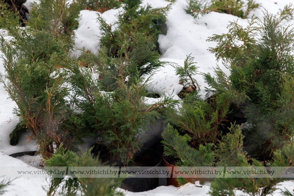 Лет пятнадцать назад здесь занялись выращиванием хвойников в горшках. Большие поляны горшечных туй, еще укрытые снегом, едва угадываются по макушкам. Такой метод позволяет обеспечивать высадку без привязки к сезону.