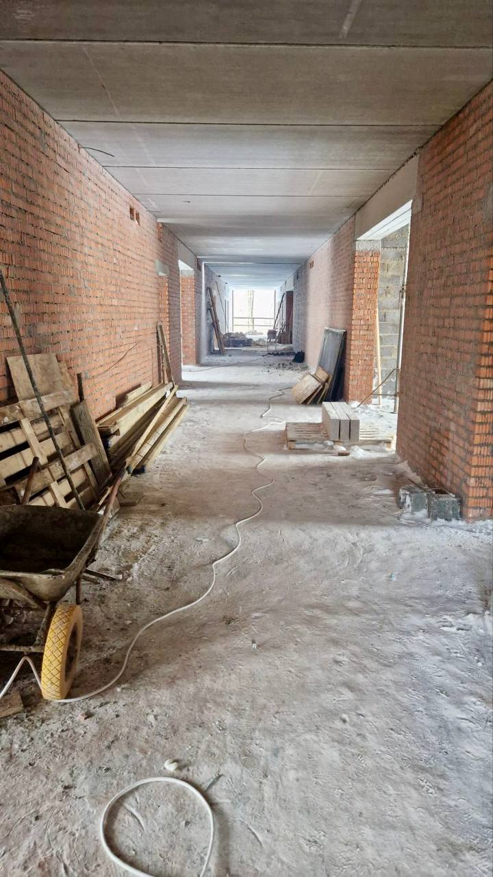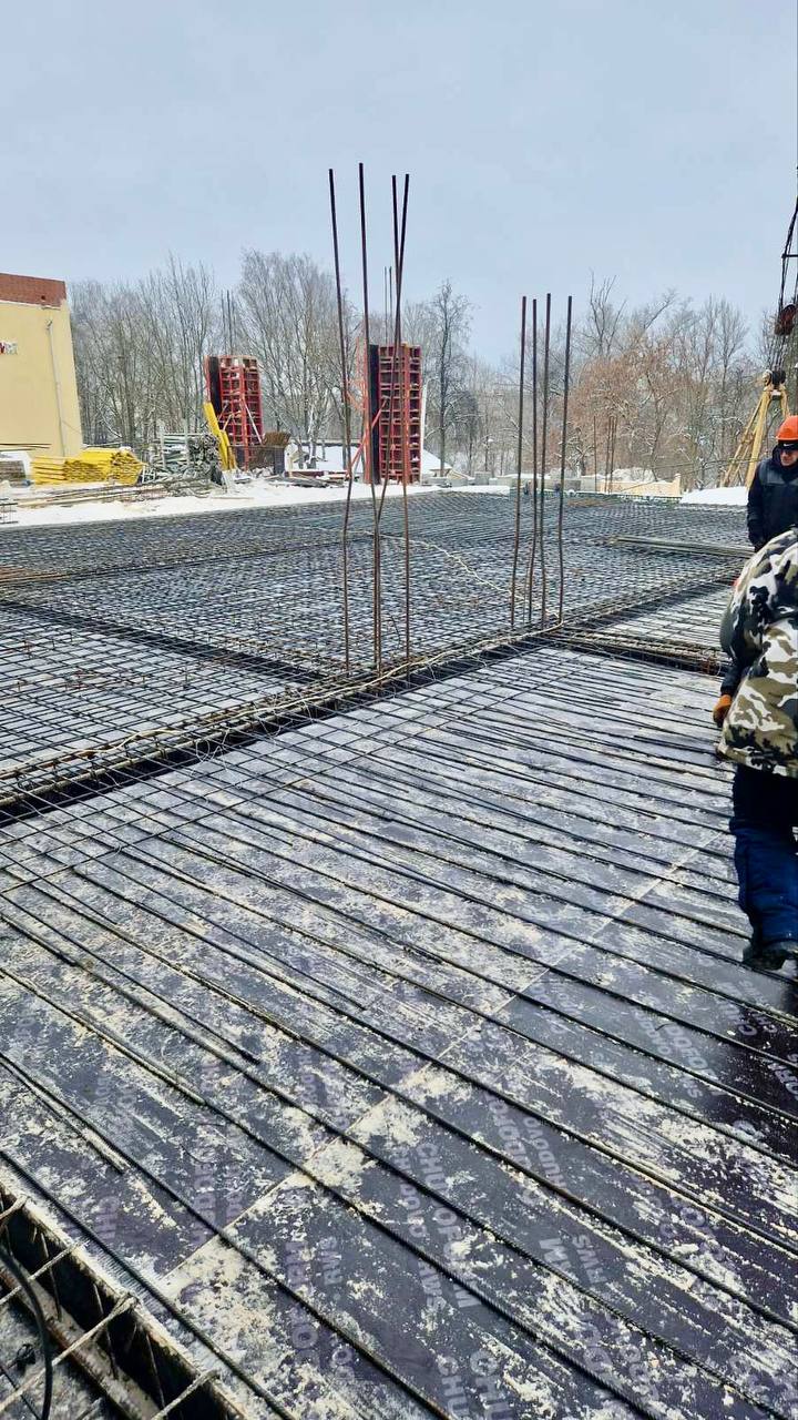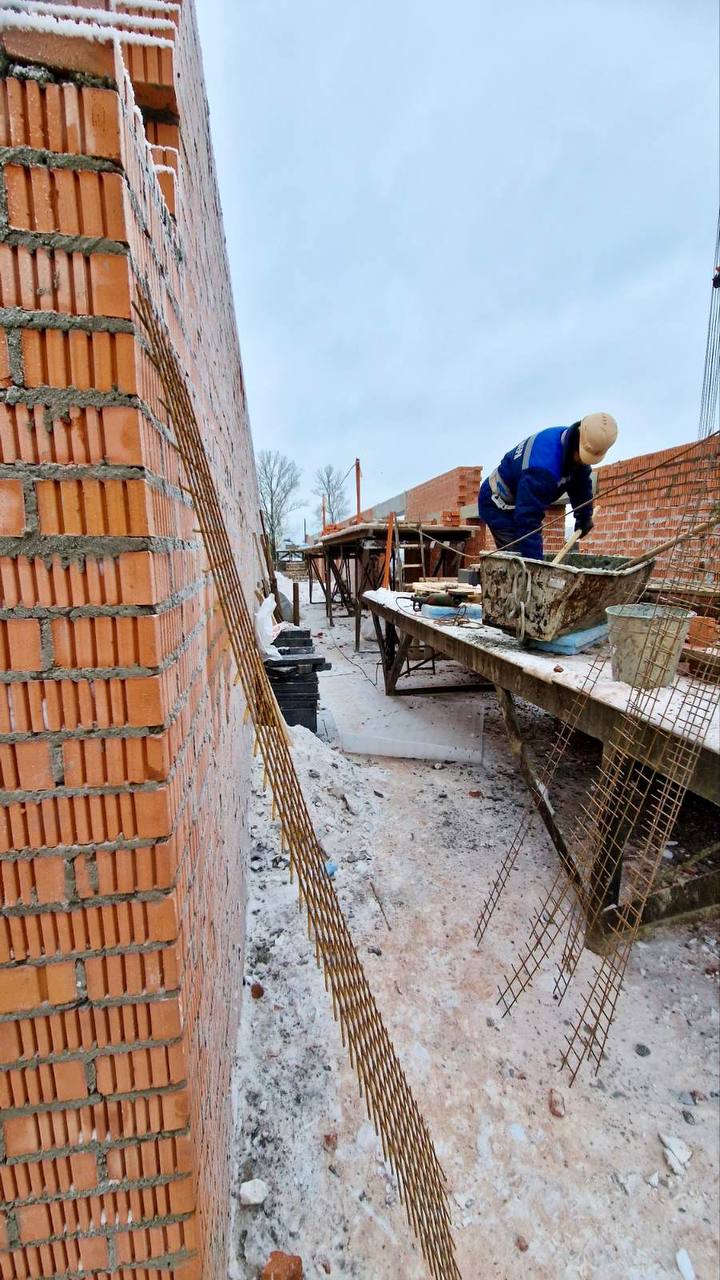 Сейчас на объекте выполняется прокладка наружных сетей. Идут работы по возведению новой части здания, кладка стен, устройство монолитного каркаса, а также общестроительные работы по существующей части здания.