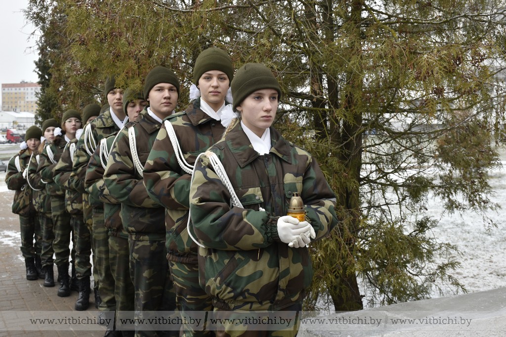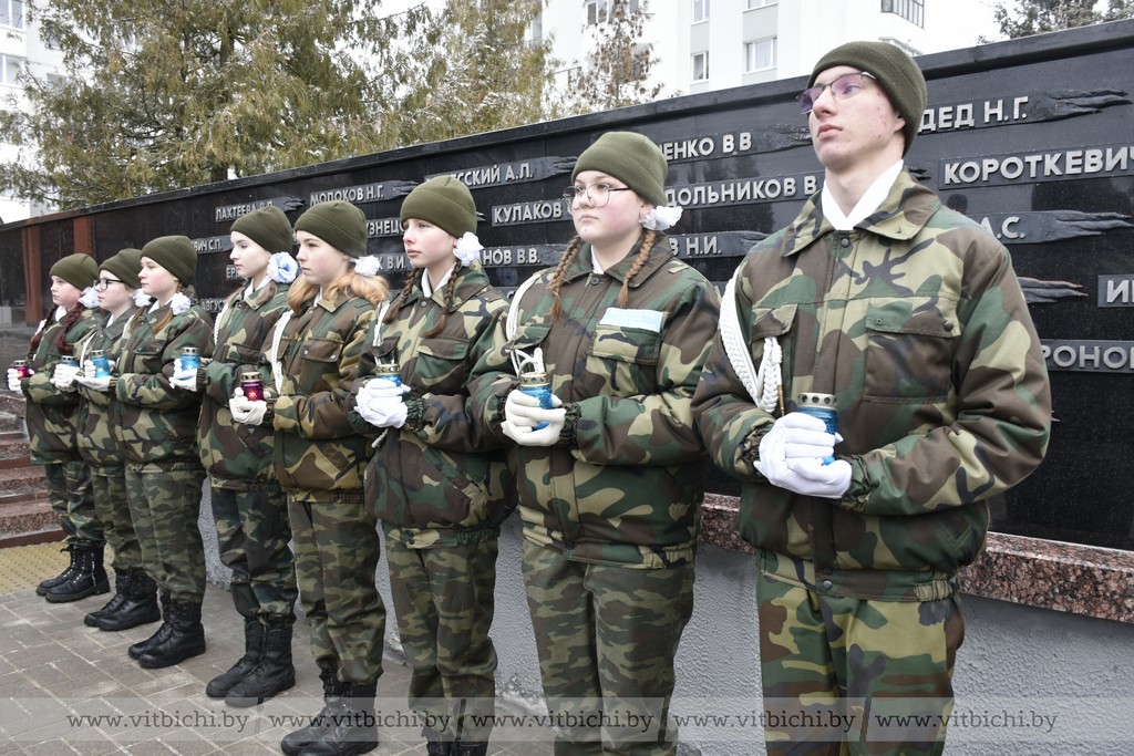 Учащиеся военно-патриотического клуба «Гвардия» средней школы № 45 Витебска имени В. Ф. Маргелова установили у подножия мемориала символические свечи. К памятнику легли живые цветы.