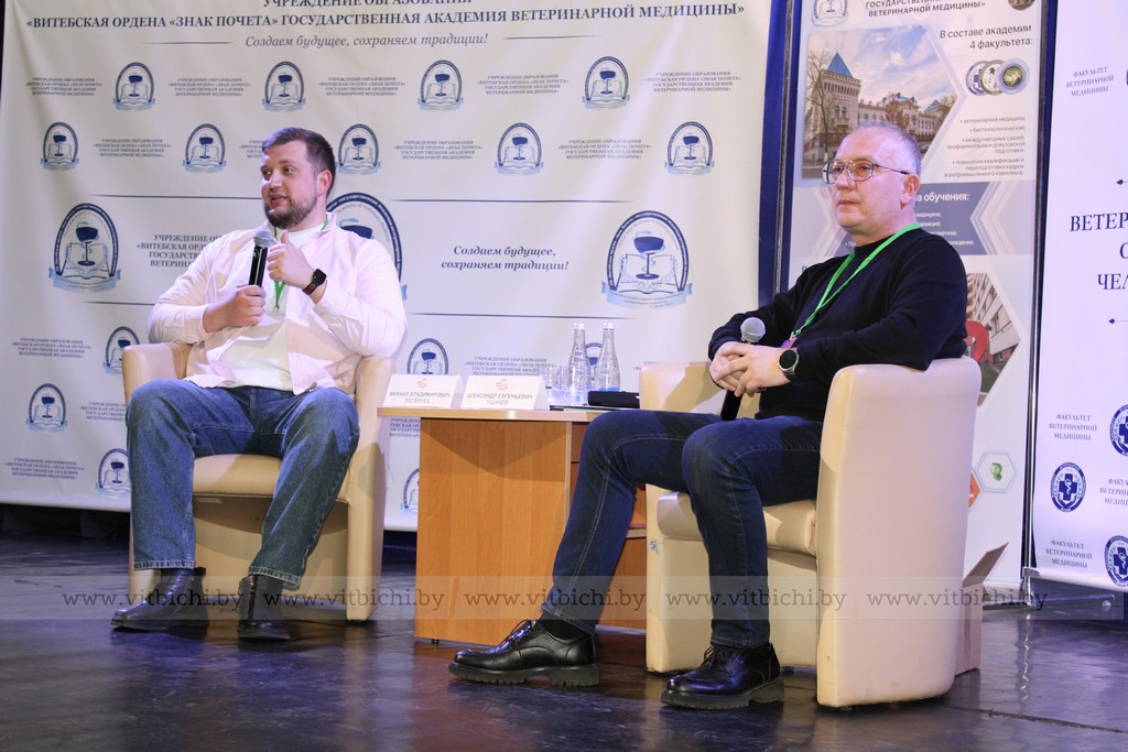 Приглашенные эксперты – директор клиники «Альфа Вет», ветеринарный врач, дерматолог Александр Ушачёв и ветеринарный врач, менеджер по научным коммуникациям Royal Canin Беларусь Михаил Логвинец – обсудили с учащейся молодежью, как проходит становление ветврача, какие вызовы и успехи могут ожидать молодых специалистов.