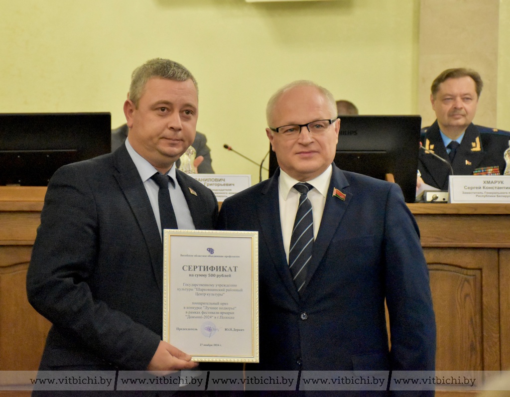 Председатель Витебского областного объединения профсоюзов Юрий Деркач вручил награды победителям областного смотра-конкурса тематических площадок «Лучшее подворье», который проходил в рамках фестиваля-ярмарки «Дажынкі-2024» в Полоцке. Призы получили руководители Браславского, Докшицкого, Полоцкого и Россонского районов. Поощрительные призы – для учреждений культуры Шарковщинского района и Новополоцка.