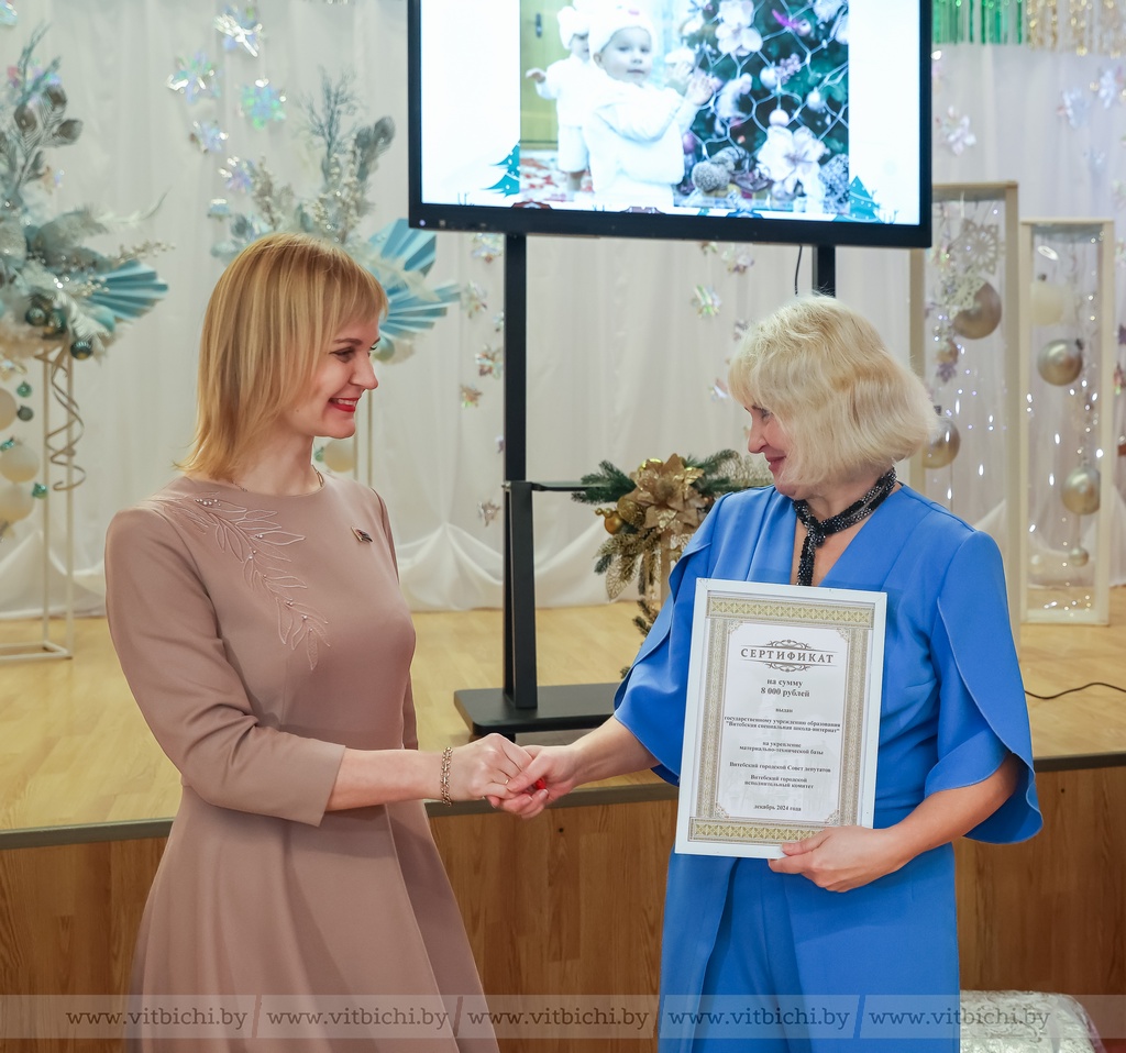 Генеральный директор Витебской бройлерной птицефабрики Анна Норкус вручила директору учреждения Елене Акимовой сертификат на 20 тысяч рублей для развития материально-технической базы, а ее заместитель Раиса Ершова преподнесла в дар корзину вкусняшек – детской продукции предприятия.