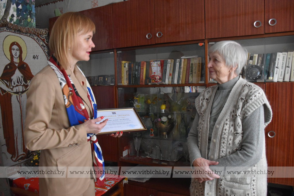 На протяжении трех праздничных недель в Витебске проходила благотворительная акция для пожилых людей «От всей души». Завершая марафон добрых дел, глава депутатского корпуса города Ольга Иванова навестила ветерана труда Марию Кацкевич и вручила ей Почетную грамоту городского Совета депутатов.