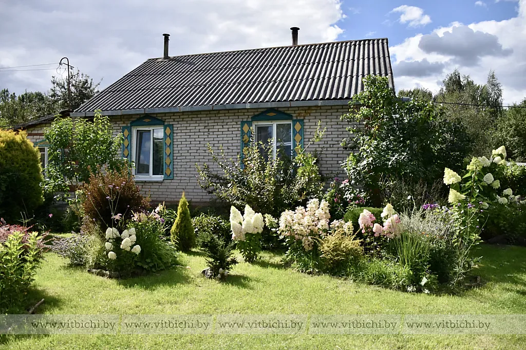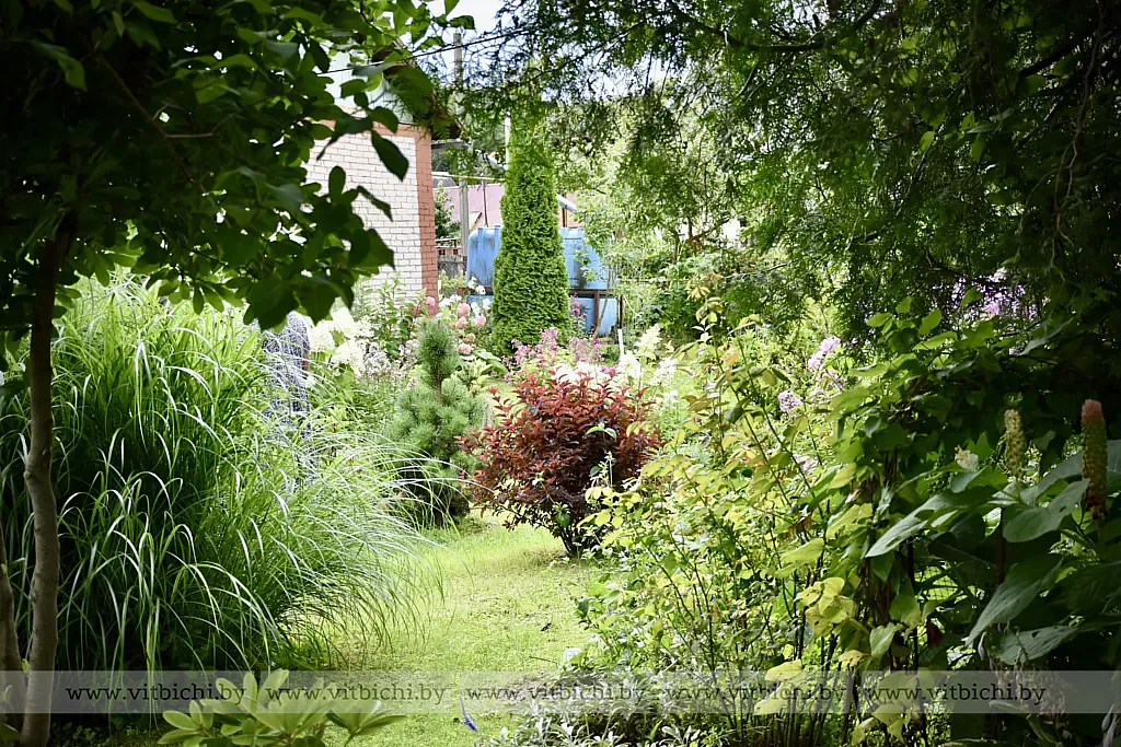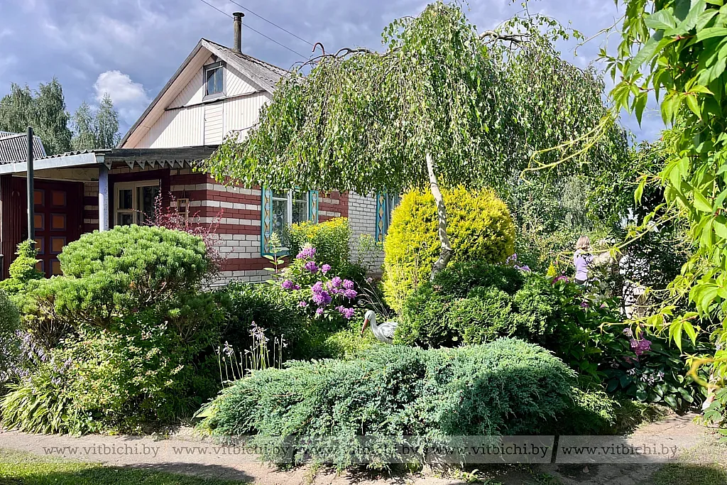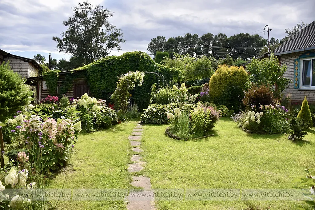 В него гидрометеоролог Вера Гончарова въехала с мужем 50 лет назад, получив комнатку как молодой специалист, разделив соседство с еще несколькими работниками витебской метеостанции. В этих стенах родились в семье Гончаровых сын и дочь, со временем разрешился вопрос с расселением других квартиросъемщиков, и оказалась Вера Захаровна единовластной хозяйкой заветных придомовых соток! Нельзя сказать, что они сразу превратились в цветочные кущи — чего уж там, семья есть семья: разбивали и грядки, ставили парники, выращивали овощи, фруктовые деревья высаживали. Всё это и сейчас присутствует в хозяйстве, правда, фоном. Со временем Вера Захаровна все-таки оставила под цветы, травы, хосты большую часть приусадебного участка. И своим творчеством, красотой выращиваемых ею растений, талантом ландшафтного архитектора очаровала не только родных, но и всех, кто приходил и любит приходить до сих пор в этот гостеприимный, хлебосольный дом. Гостей же бывает очень много. Прежде всего, это дети и внуки — дочь подарила троих, сын — четверых! У самой Веры Захаровны родительская семья тоже была многодетной — семеро ребятишек, да и у мужа родни хватало. Поэтому выражение «накрыть поляну» — это как раз про хозяйку дома! «Райскую жизнь» она устраивать любит. Здесь действительно всё напоено красотой, тишиной, спокойствием и гармонией, ароматом трав и цветов.