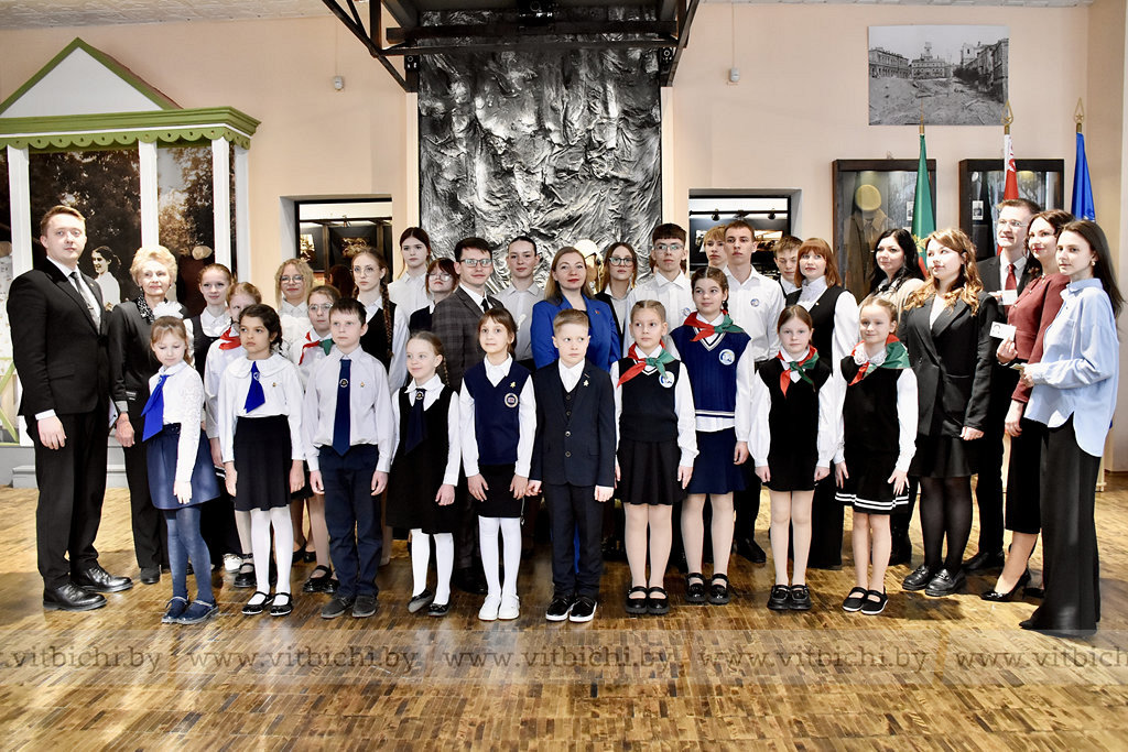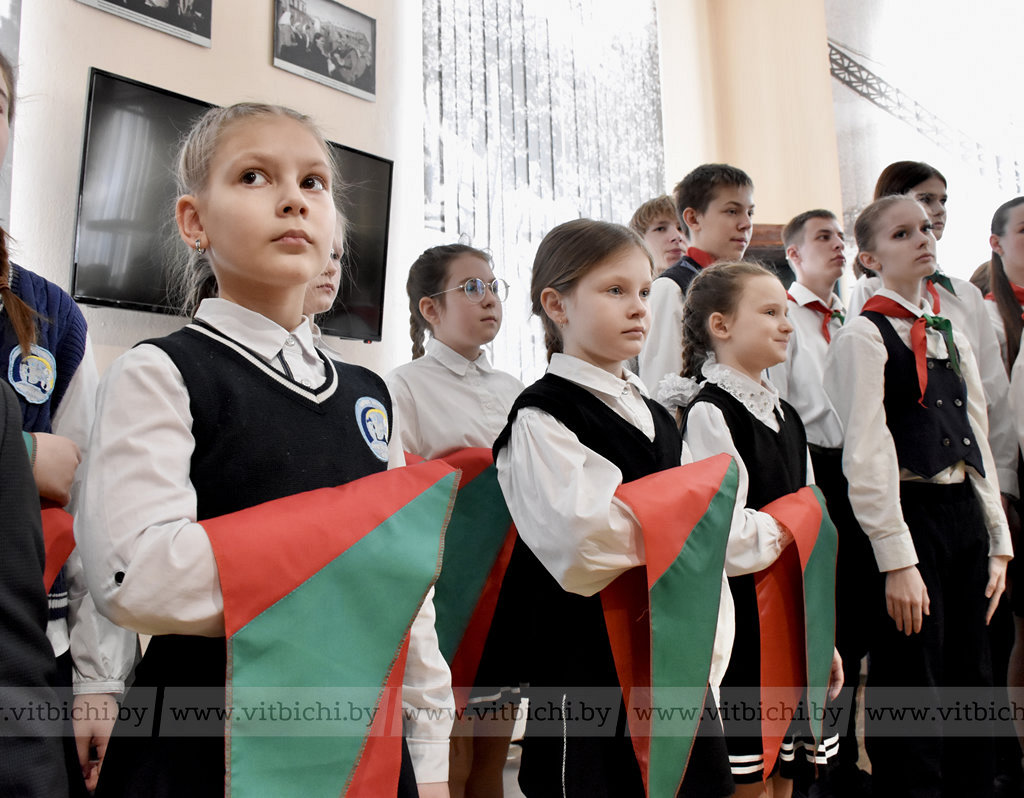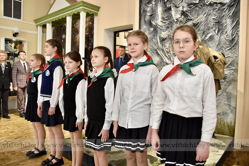 Председатель Витебского городского совета Белорусской республиканской пионерской организации Мария Зайцева и Лариса Оленская, которая возглавляет городской совет Белорусского общественного объединения ветеранов, повязали ребятам пионерские галстуки, а ученикам начальной школы прикололи октябрятские звездочки.