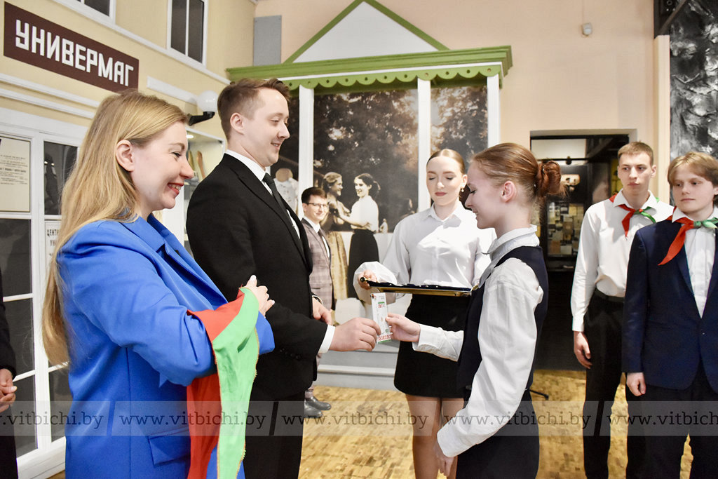 Первый секретарь Витебского городского комитета общественного объединения «Белорусский республиканский союз молодежи» Александр Бышнёв вручил самым активным и успешным в учебе старшеклассникам, вчерашним пионерам, членские билеты ОО «БРСМ», а Виктор Глушин – членские билеты и значки РОО «Белая Русь» представителям работающей молодежи нашего города.