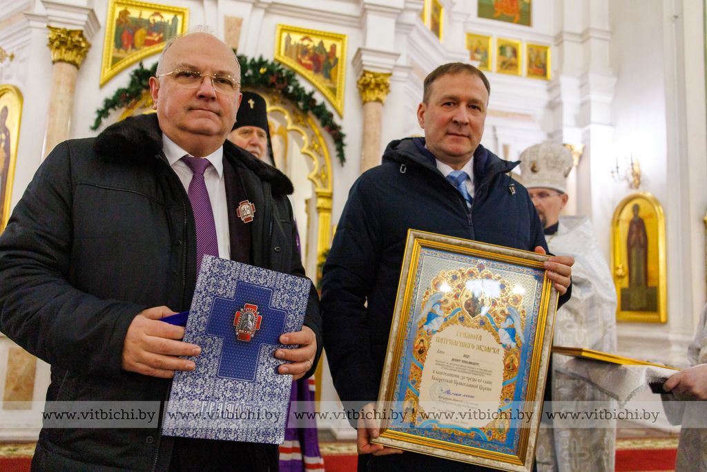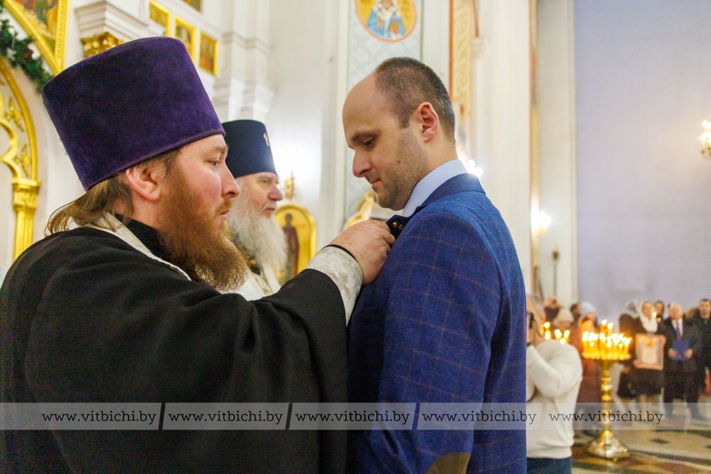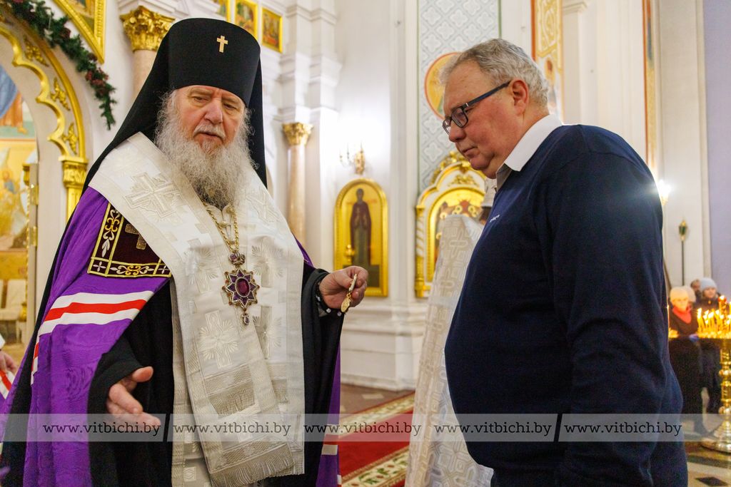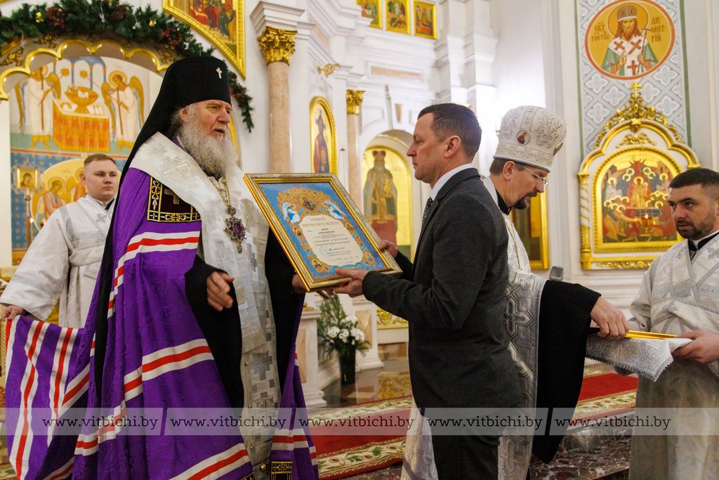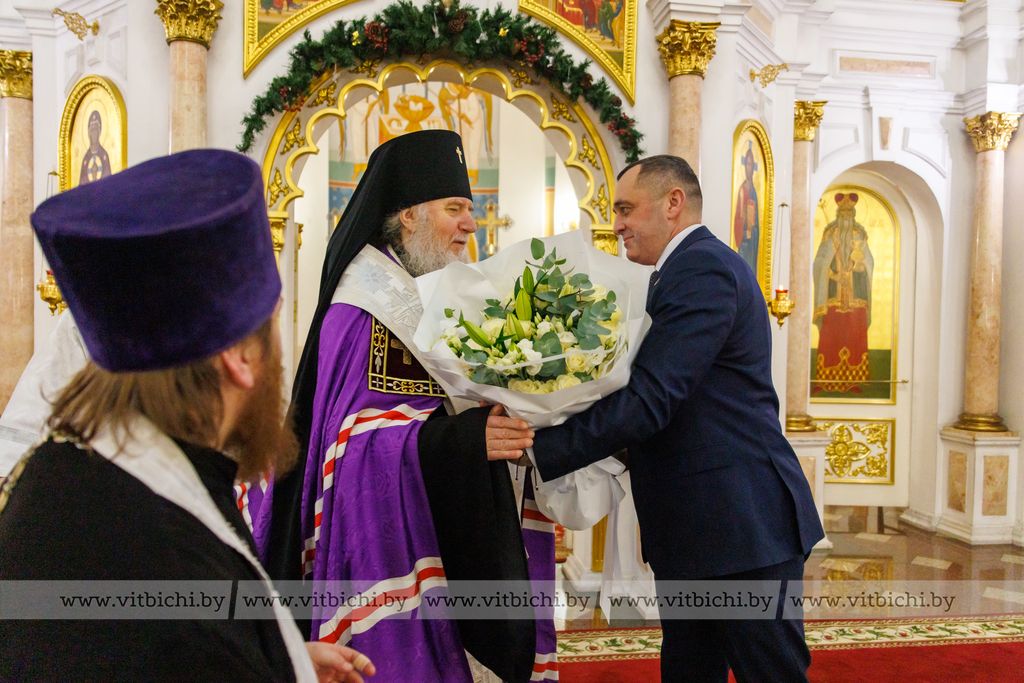 Председатель Витебского облисполкома Александр Субботин подарил владыке белые розы как символ чистоты христианской веры. Глава области в своем поздравлении пожелал всем находившимся в храме счастья, мира, божьей помощи.