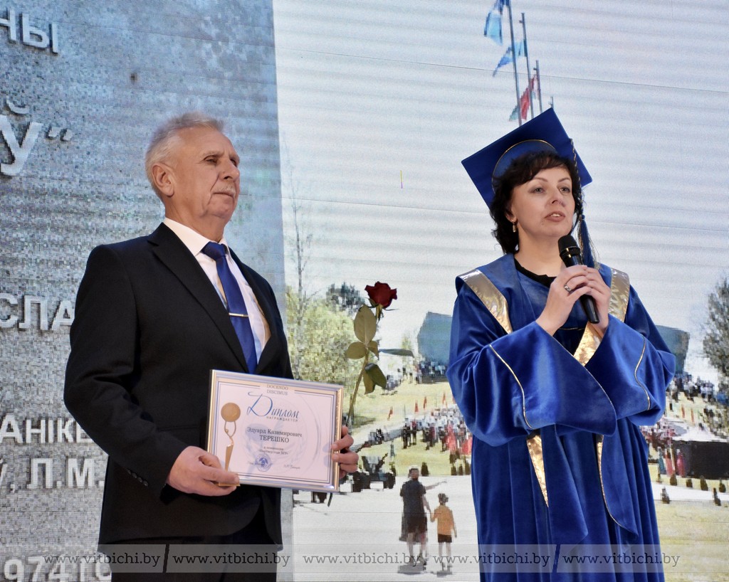 На торжественном совете университета особые слова благодарности прозвучали в адрес настоящего патриота, активиста Витебщины Эдуарда Терешко, который вносит весомый вклад в идеологическую и воспитательную работу университета. Валентина Богатырёва вручила Эдуарду Казимировичу диплом лауреата «Партнер года ВГУ». Еще одним важным социальным партнером ВГУ в этом году стал Псковский государственный университет. Ректор российского вуза, доктор биологических наук, профессор Наталья Ильина передала участником торжественного собрания видеопоздравление с днем рождения витебского университета.