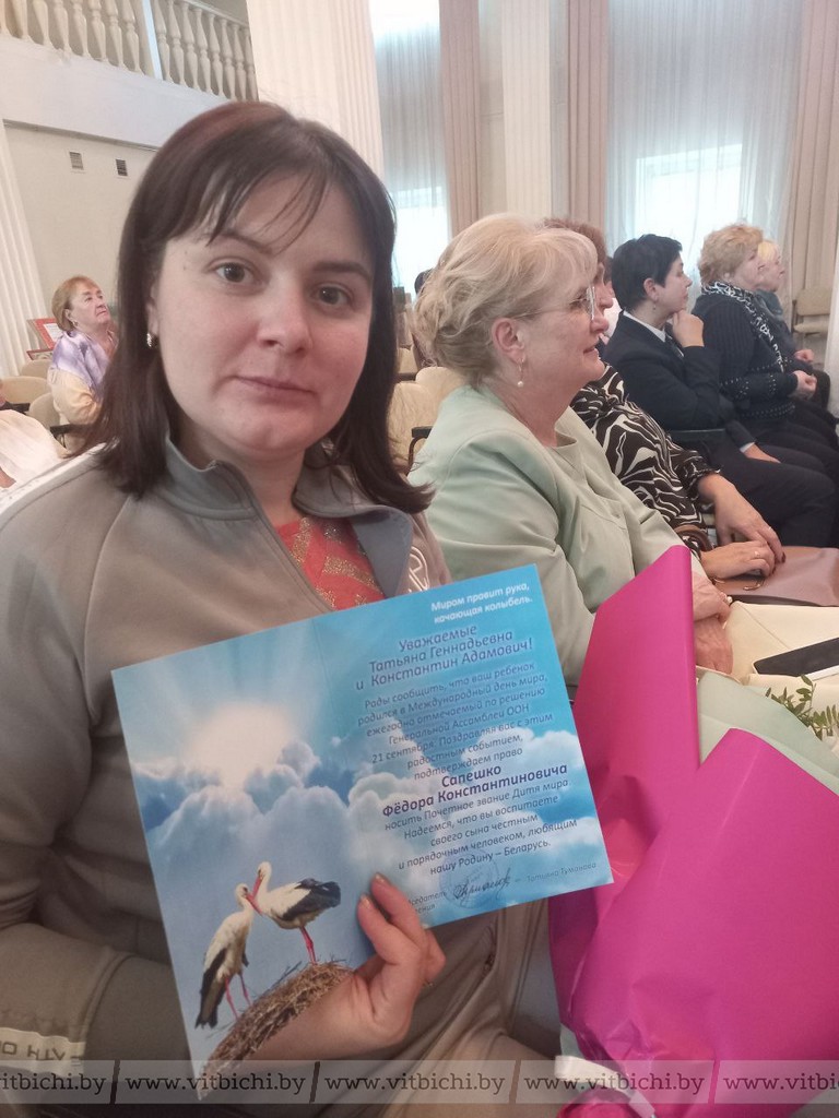 Теперь звание «Дитя мира» носят Полина Баран – это свидетельство вручили ее родителям Виктории Леонидовне и Сергею Николаевичу; сынок Татьяны Геннадьевны и Константина Адамовича Сапешко – Фёдор, а также Ильюша Сахончик, о чем ему обязательно расскажут мама Елена Валерьевна и папа Александр Ильич.