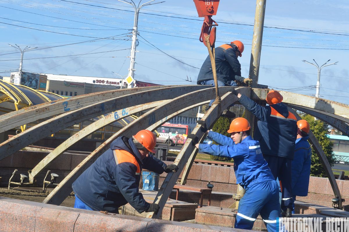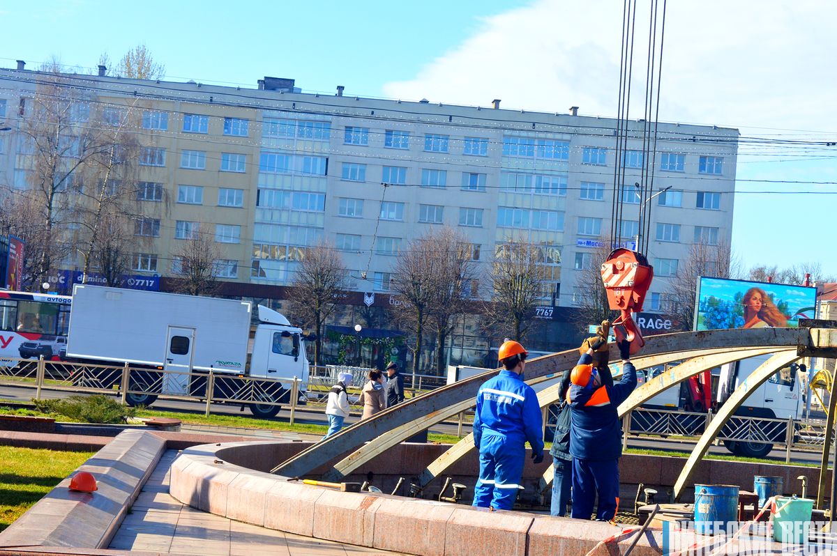 Сегодня утром специалисты на площади Победы на одном из фонтанов демонтировали зимний купол фонтанной чаши, подцепив его конструкции краном. Этот процесс запечатлел корреспондент «ВВ».