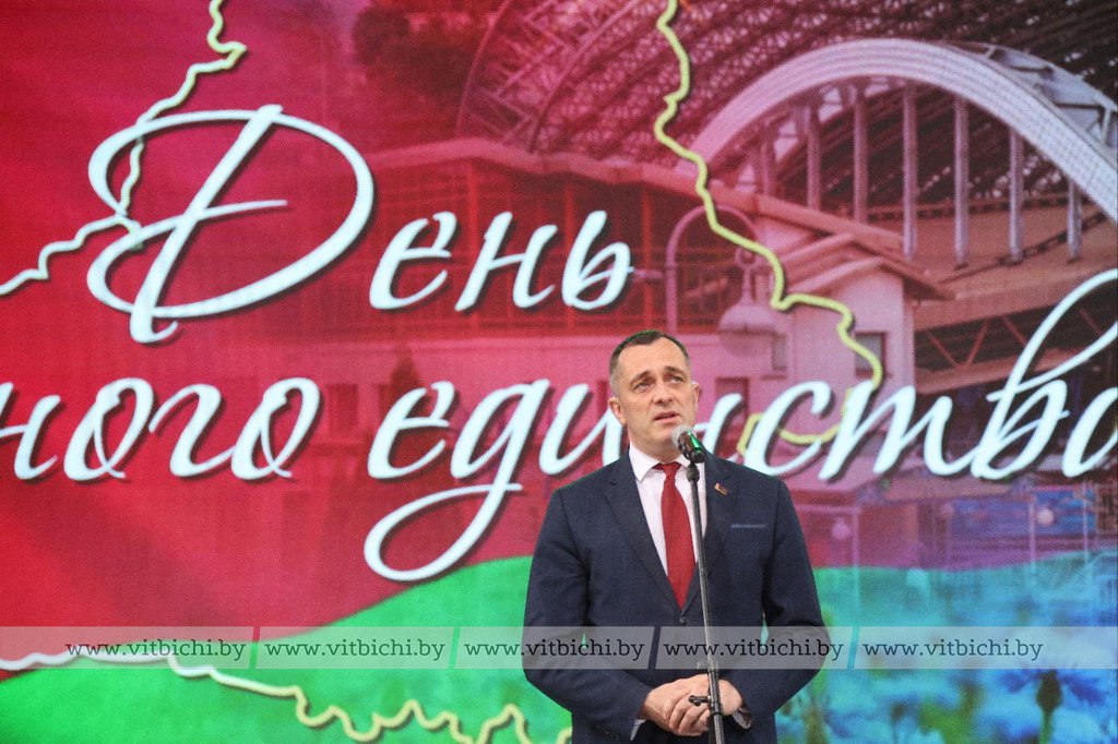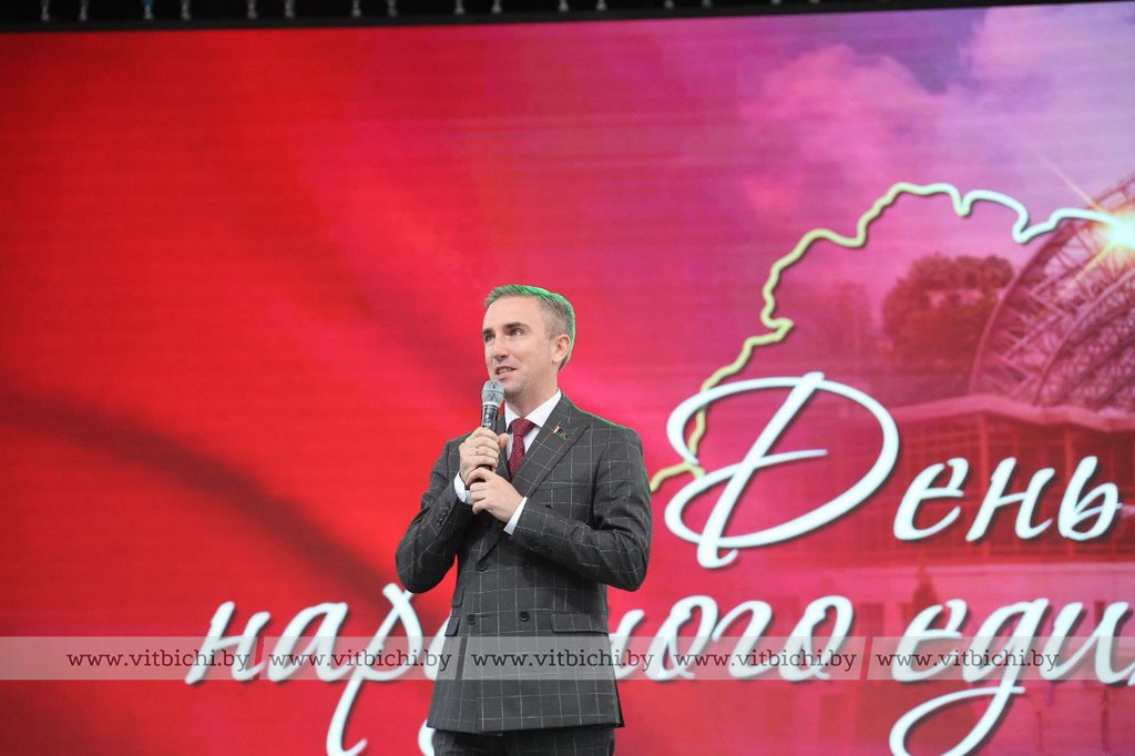 Искренне и от всего сердца со сцены Летнего амфитеатра поздравил земляков с Днем народного единства председатель Витебского облисполкома Александр Субботин:
