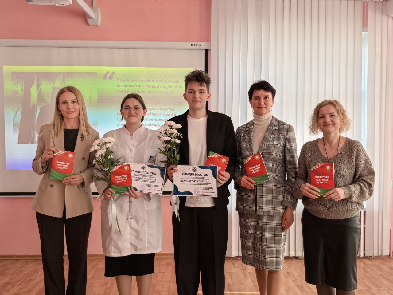 Торжественным моментом стало чествование лучших учащихся. За достигнутые успехи учащимся отделения «Лечебное дело» Родиону Лемешкову и Веронике Филиповой назначены профсоюзные стипендии на второй семестр учебного года. Им вручены печатные издания Конституции страны.