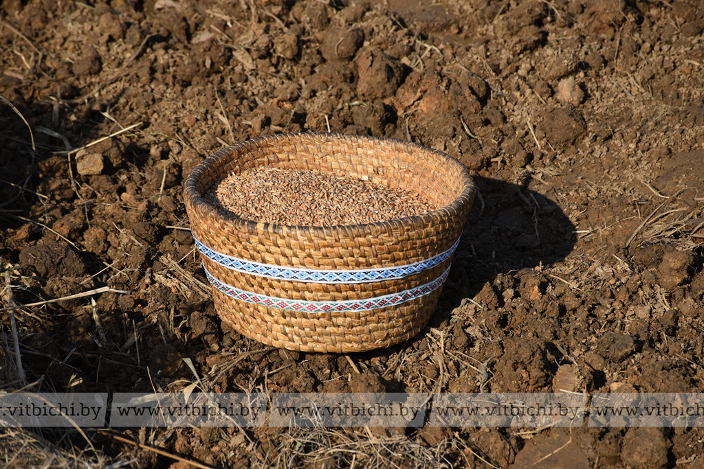 Согласно обряду «Засевки» сначала землю-кормилицу «угостили», поставив на край поля плетеный короб с отборным зерном. Затем главе района и другим «сеятелям» предложили омыть руки, угоститься караваем из муки 2025 года и встать на домотканый рушник, чтобы набраться сил и приступить к работе, с чистым сердцем и добрыми мыслями. И вот под душевные песни народного ансамбля «Вераснянка» из агрогородка Мазолово первые зерна ячменя коснулись земли.