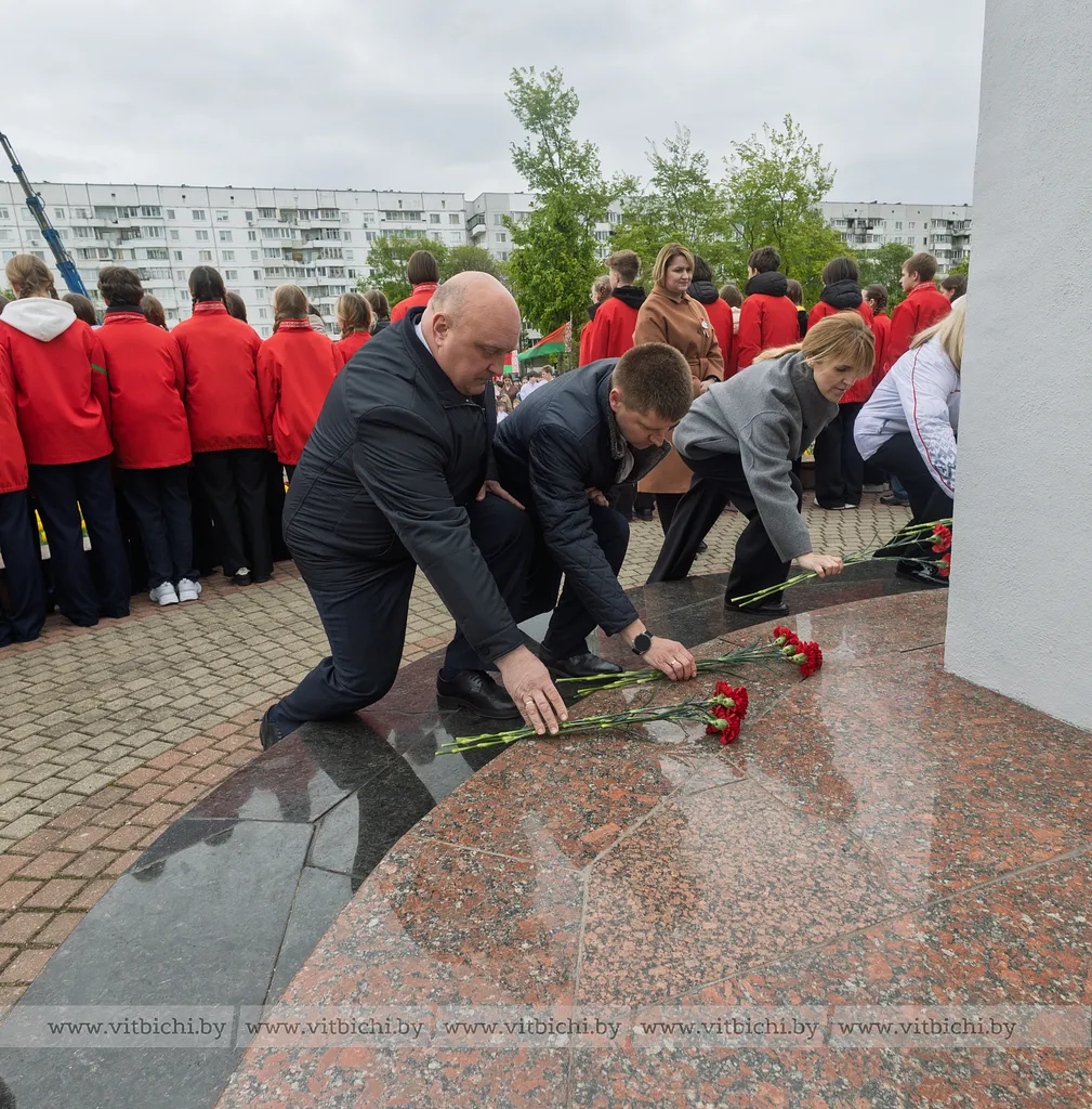 Затем глава администрации Первомайского района Евгений Семёнычев и другие гости праздника возложили цветы к памятному знаку.