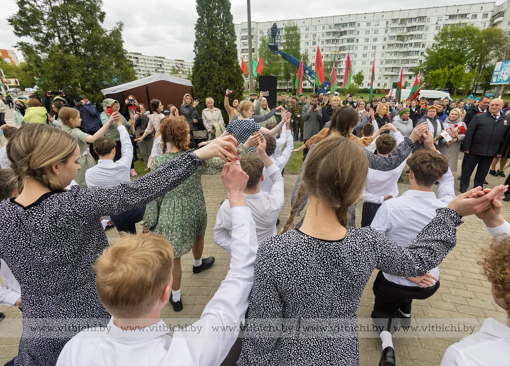 Участниками республиканской творческой акции «Вальс Победы» стали 80 пар из школ и гимназий Первомайского района. Проходило мероприятие у памятного знака «Орден Победы». И хоть погода была пасмурной, на лицах молодых людей читались радость и приятное волнение.