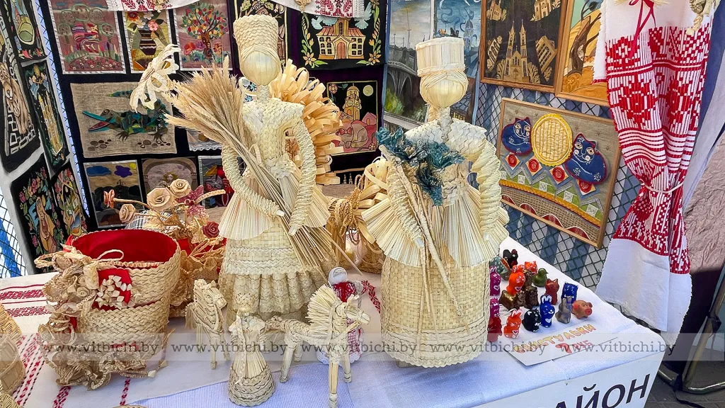 Гимназия №4 города Витебска на ярмарке представила работы своих учащихся. Преподаватель изобразительного искусства Ирина Борисевич обратила наше внимание на изделия из соломки. Кукол дети делают на факультативных занятиях, сувениры представлены как выставочный экспонат. Здесь же коллажи в технике пэчворк, изделия из кожи и многое другое.