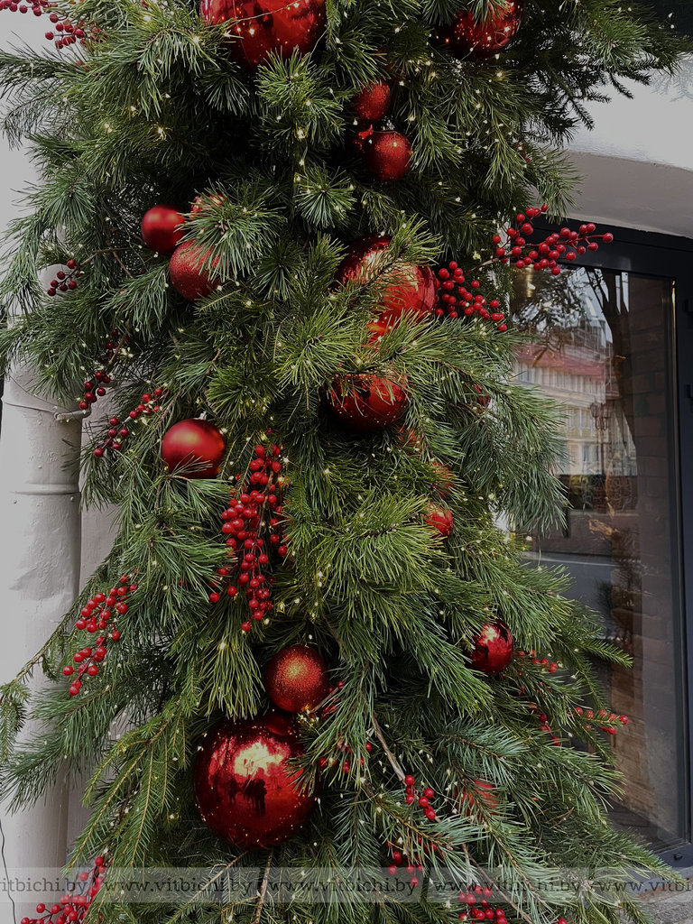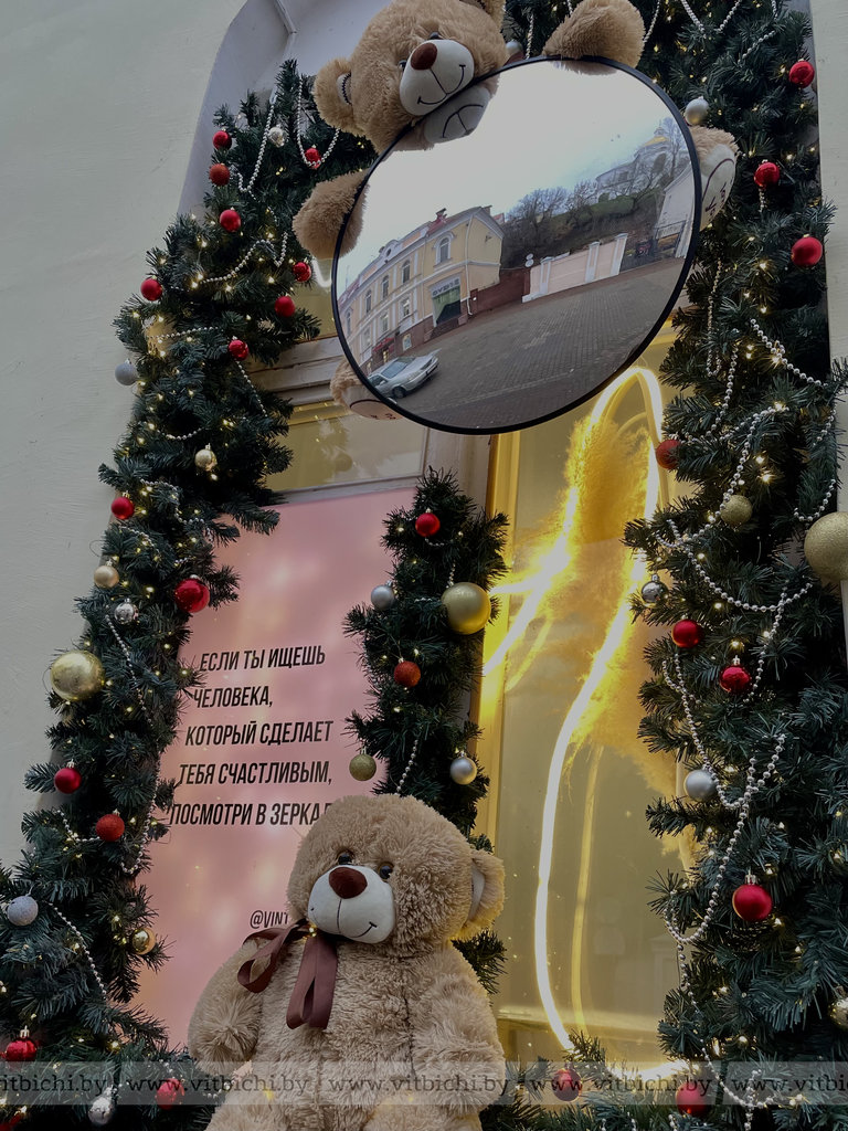 А в одном из витебских магазинов с витринами, украшенными еловыми ветками, шарами и гирляндами, акцент сделали на замечательных плюшевых мишках. Кстати, здесь у входа большое зеркало, и оно стало популярным местом для фотосессий, а еще прохожие ловят в нем отражение огней и игрушек.