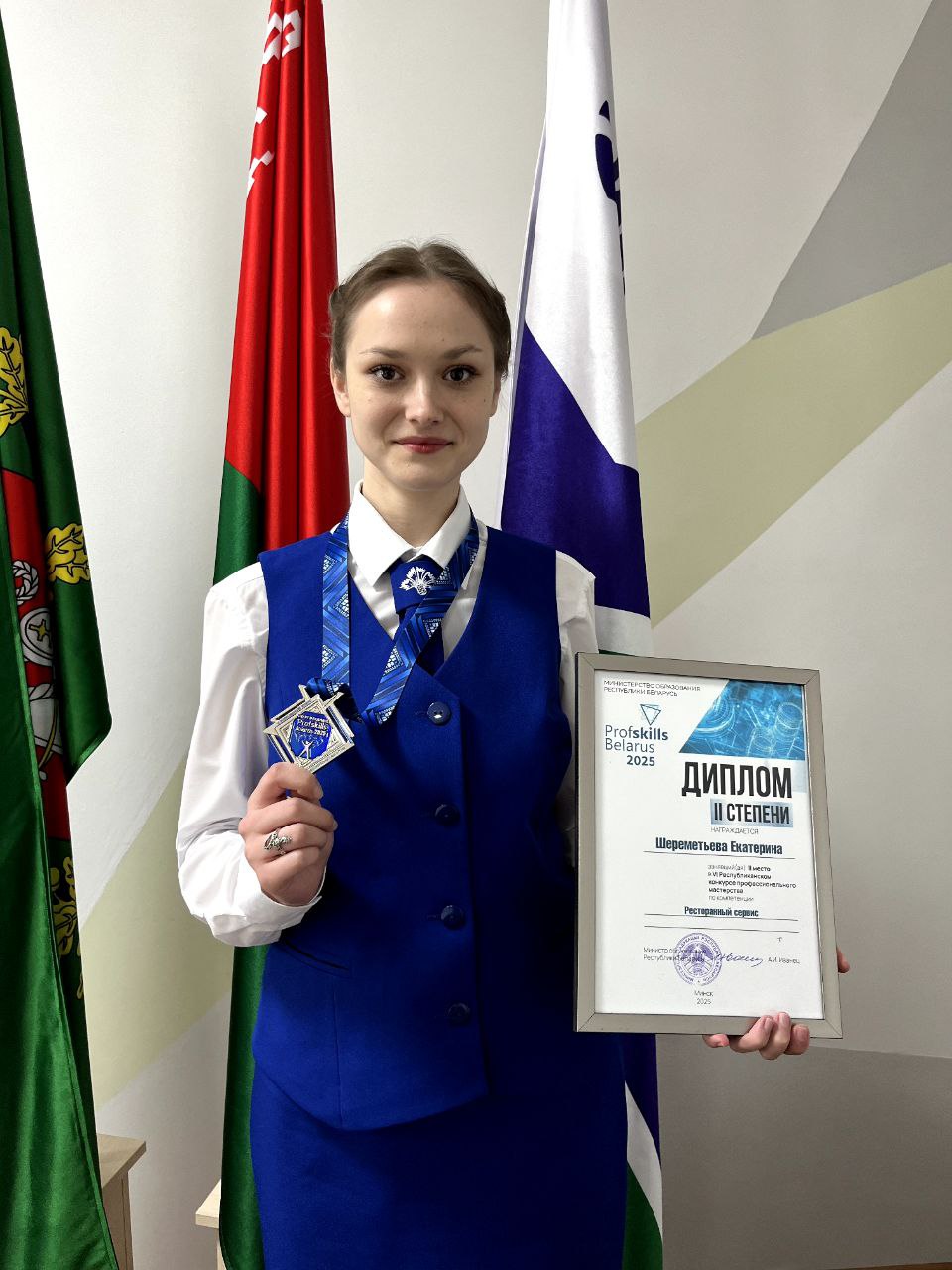 В прошлом году Екатерина Шереметьева победила в номинации «Бариста» в международном конкурсе «Шелковый путь», который был организован Китайской Народной Республикой. Екатерина получила специальность «официант», сейчас она учится на уровне среднего специального образования по специальности «техник-технолог, мастер производственного обучения» и уже сама в ближайшем будущем сможет готовить ребят к участию в международных конкурсах и ProfSkills Belarus.
