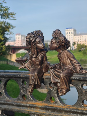 Знаете, мы были свидетелями таких красивых историй любви! Но особенно трепетно храним в памяти образ молодой девушки с длинными вьющимися волосами и большими карими глазами. Она так робко и вместе с тем решительно бежит навстречу с любимым – простым бедным художником. Все говорили, что они не пара. Но для настоящей любви нет преград! Мы видели, как она, окрыленная чувствами, отрывается от земли и увлекает его с собой в полет… И вот они летят над городом, над суетой и бренностью мира, а Витебск по-детски восторженно машет им рукой! Знаете, если Вы внимательно посмотрите на васильковое витебское небо, может быть, тоже увидите их – летящих вместе на крыльях любви!